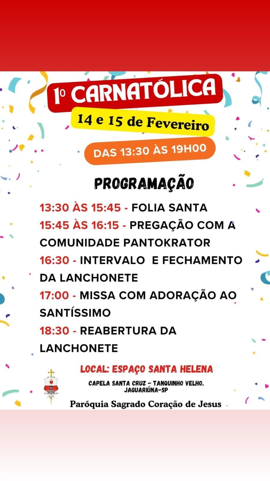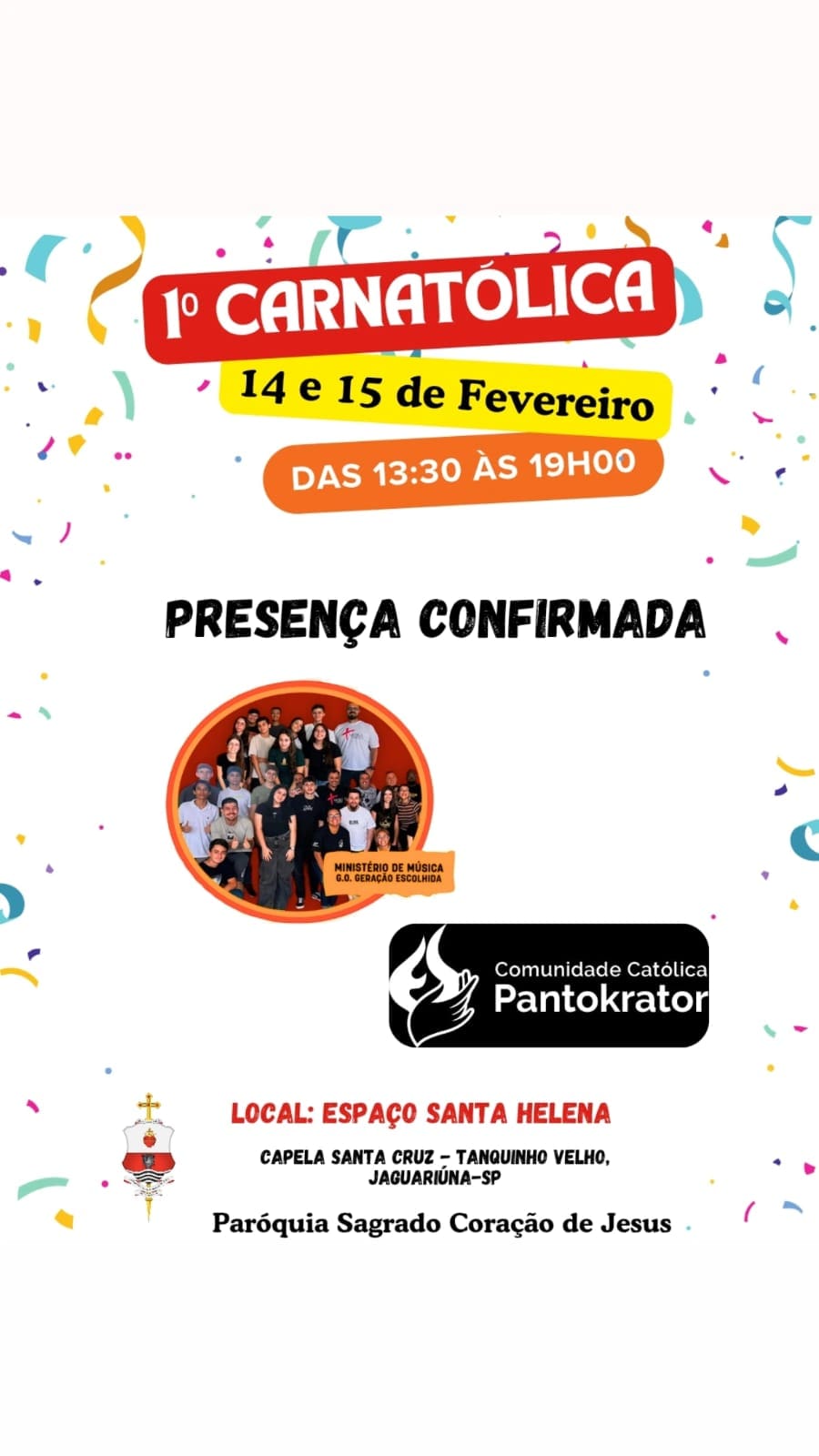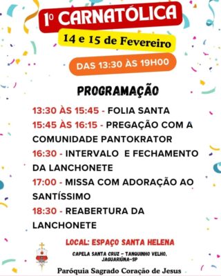 A Capela Santa Cruz, localizada no bairro Tanquinho Velho, em Jaguariúna (SP), pertencente à Paróquia Sagrado Coração de Jesus, realiza nos dias 14 e 15 de fevereiro, das 13h30 às 19h, o 1º Carnatólica, evento voltado a toda a família e marcado por momentos de espiritualidade, convivência e animação.