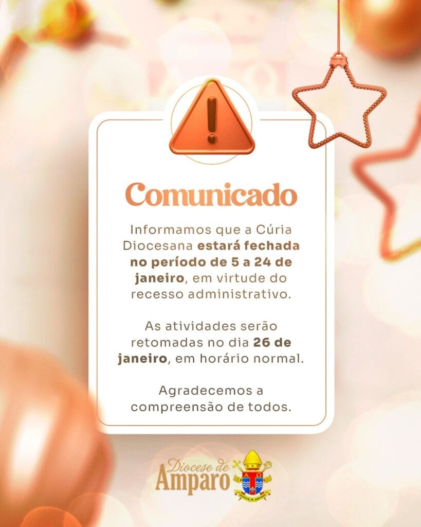 Comunicado Recesso da Cúria Diocesana Informamos que a Cúria Diocesana estará fechada no período de 5 a 24 de janeiro, em virtude do recesso administrativo. As atividades serão retomadas no dia 26 de janeiro, em horário normal de funcionamento. Agradecemos a compreensão de todos.