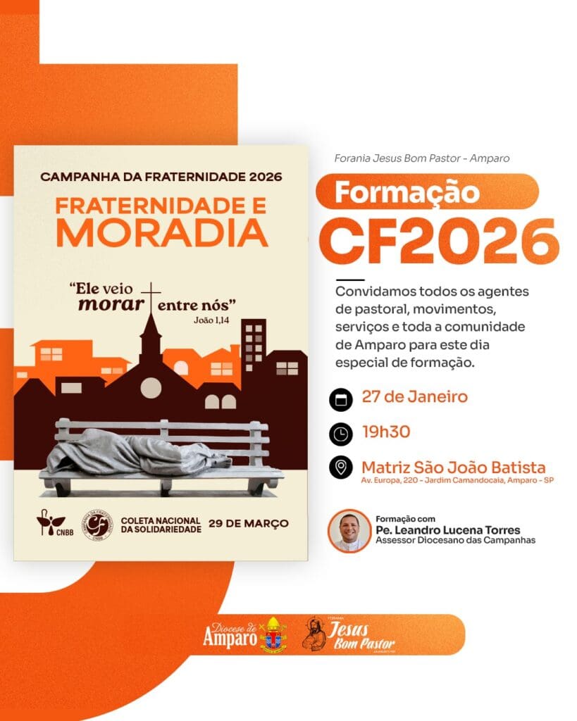 Forania Jesus Bom Pastor promove Formação da CF 2026 em Amparo A Forania Jesus Bom Pastor realizará, no dia 27 de janeiro, um encontro de formação da Campanha da Fraternidade 2026, com o tema “Fraternidade e Moradia”, destinado aos agentes de pastoral, movimentos, serviços e a toda a comunidade da cidade de Amparo. Inspirado pelo […]