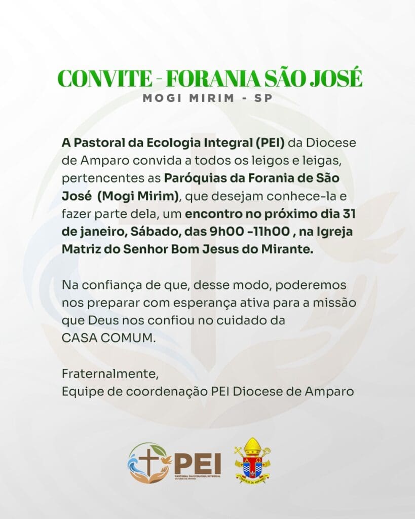 PEI promove encontro formativo na Forania São José, em Mogi Mirim A Pastoral da Ecologia Integral (PEI) da Diocese de Amparo realiza, no próximo dia 31 de janeiro, um encontro formativo e de acolhida com leigos e leigas das paróquias que integram a Forania São José, no município de Mogi Mirim. A iniciativa tem como […]