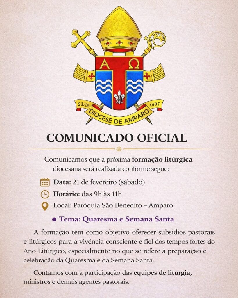 COMUNICADO OFICIAL | FORMAÇÃO LITÚRGICA DIOCESANA Em comunhão com as orientações da Comissão Diocesana de Liturgia, comunicamos a realização da próxima Formação Litúrgica Diocesana, que terá como tema Quaresma e Semana Santa. Este momento formativo tem como finalidade oferecer subsídios pastorais e litúrgicos para uma vivência mais consciente, profunda e fiel dos tempos fortes do […]