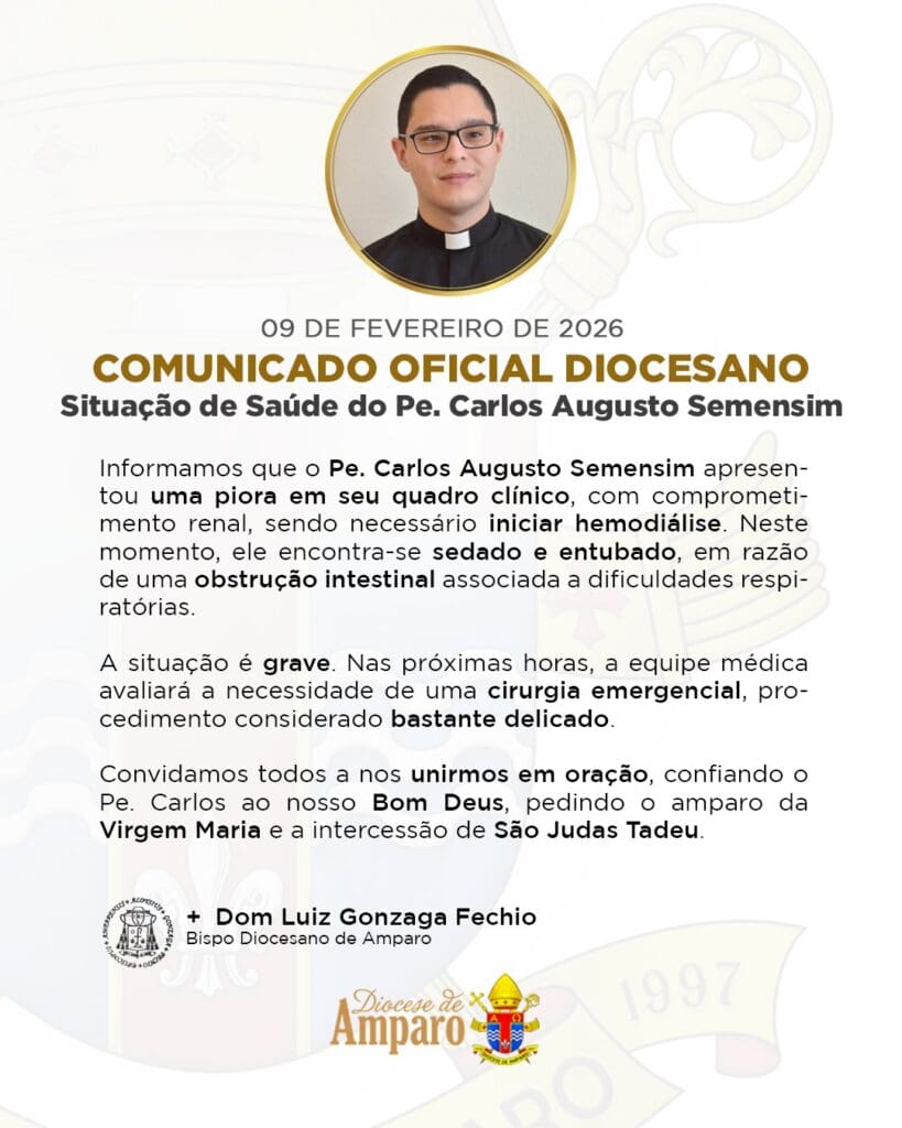 COMUNICADO OFICIAL DIOCESANO Situação de Saúde do Pe. Carlos Augusto Semensim Informamos que o Pe. Carlos Augusto Semensim apresentou uma piora em seu quadro clínico, com comprometimento renal, sendo necessário iniciar hemodiálise. Neste momento, ele encontra-se sedado e entubado, em razão de uma obstrução intestinal associada a dificuldades respiratórias. A situação é grave. Nas próximas […]