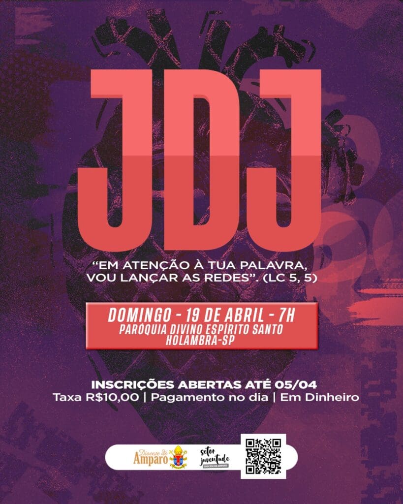 Inscrições abertas para a JDJ 2026 Estão abertas as inscrições para a JDJ – Jornada Diocesana da Juventude da Diocese de Amparo. O encontro será realizado no dia 19 de abril, com início às 7h, na Paróquia Divino Espírito Santo. Inspirada pela Palavra “Em atenção à tua palavra, vou lançar as redes” (Lc 5,5), a […]