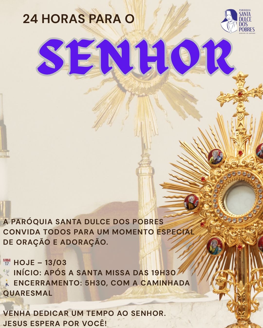 Também na Paróquia Santa Dulce dos Pobres, os fiéis são convidados a participar deste momento especial de oração e adoração. A programação terá início no dia 13 de março, após a Santa Missa das 19h30, com adoração ao Santíssimo Sacramento ao longo da noite. O encerramento está previsto para as 5h30 do dia seguinte, com a realização da Caminhada Quaresmal.