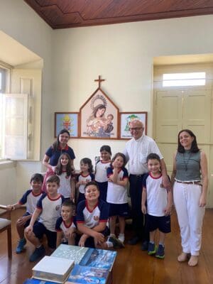 As crianças chegaram preparadas com diversas perguntas, que foram respondidas com atenção e proximidade por Dom Luiz Gonzaga Fechio. O bispo também interagiu com os estudantes, fazendo perguntas, ouvindo relatos e promovendo momentos de diálogo e acolhimento.