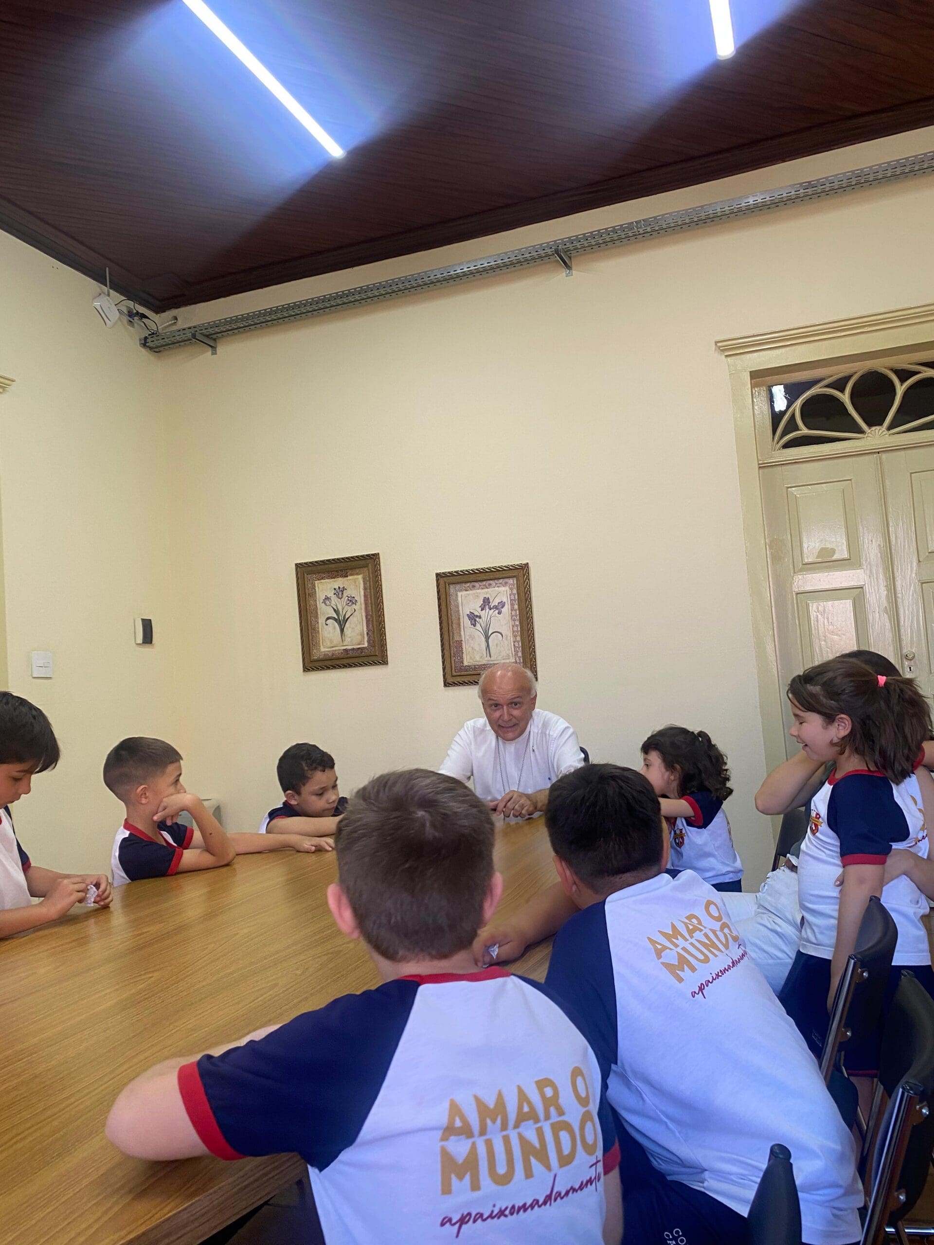 As crianças chegaram preparadas com diversas perguntas, que foram respondidas com atenção e proximidade por Dom Luiz Gonzaga Fechio. O bispo também interagiu com os estudantes, fazendo perguntas, ouvindo relatos e promovendo momentos de diálogo e acolhimento.