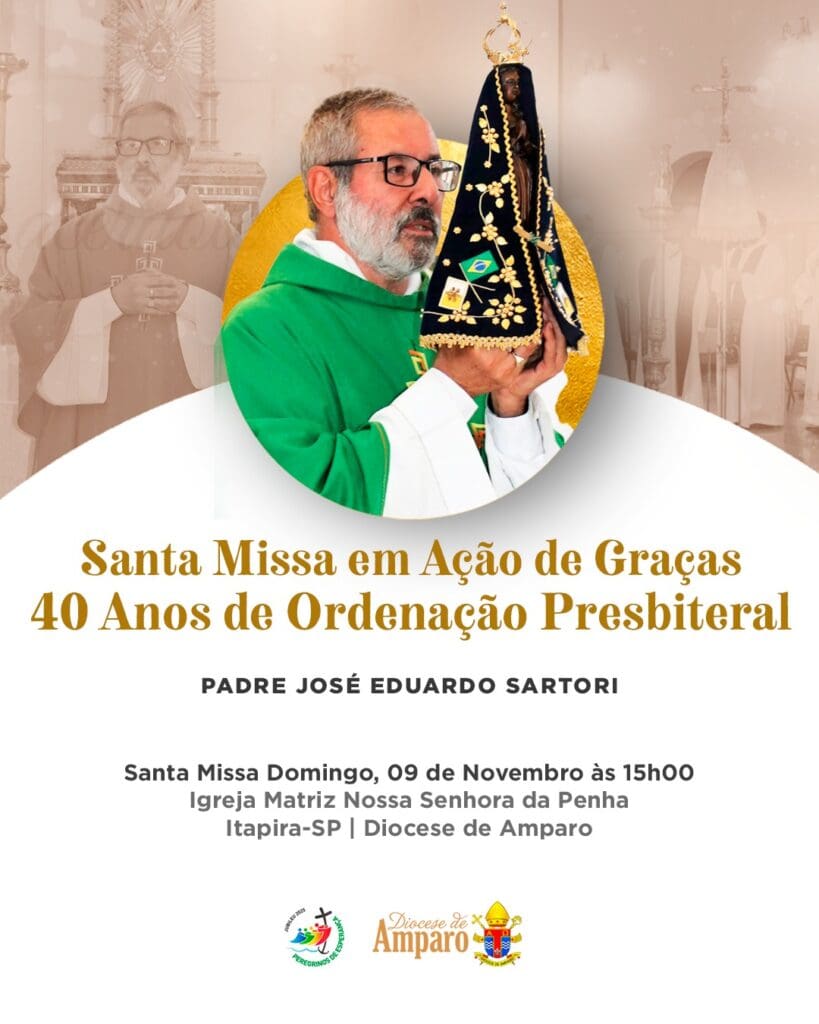 Santa Missa Celebra 40 Anos de Ordenação Presbiteral do Padre José Eduardo Sartori No próximo domingo, 9 de novembro, será celebrada a Santa Missa em Ação de Graças pelos 40 anos de Ordenação Presbiteral do Padre José Eduardo Sartori, às 15h, na Igreja Matriz Nossa Senhora da Penha, em Itapira. A celebração será presidida por […]