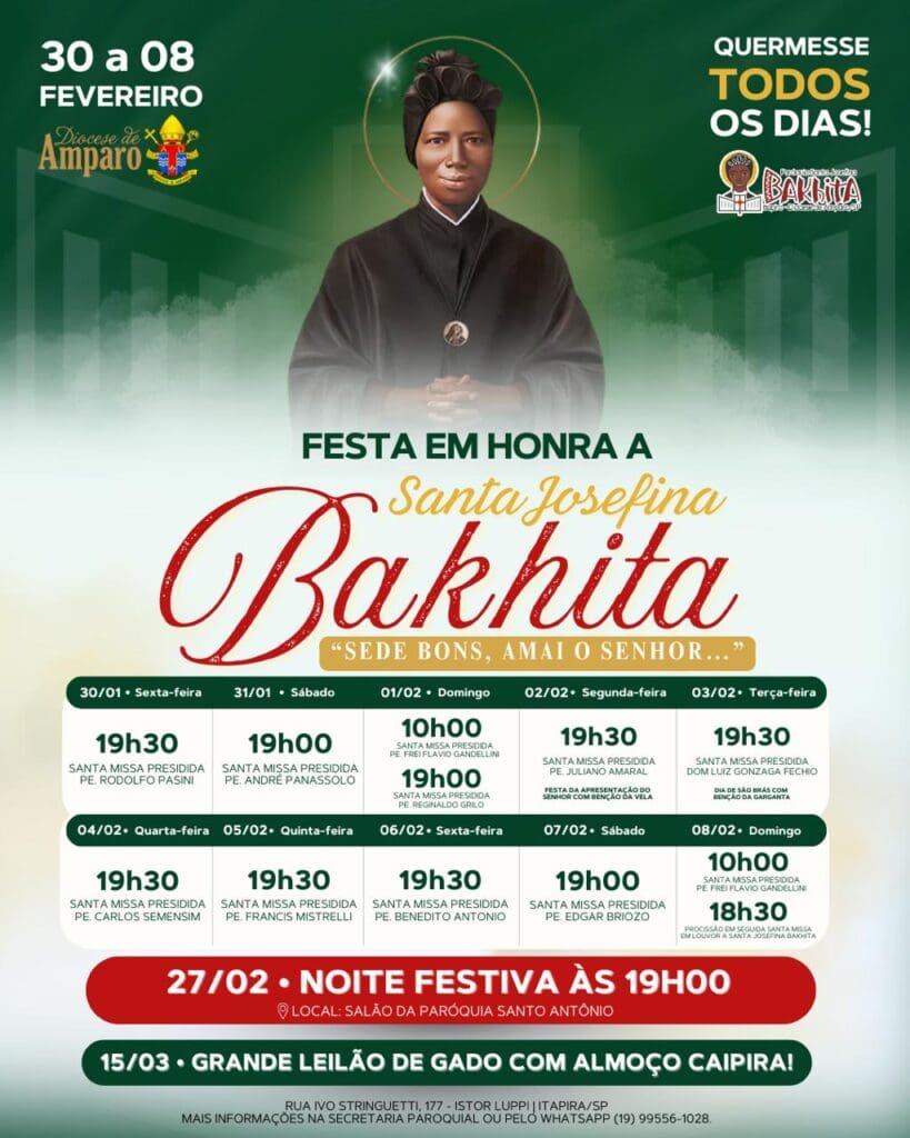 Festa de Santa Josefina Bakhita reúne fiéis em Itapira Entre os dias 30 de janeiro e 8 de fevereiro, a cidade de Itapira celebra a Festa e Novena em honra a Santa Josefina Bakhita, reunindo fiéis em momentos de fé, oração e comunhão. A novena tem início na sexta-feira (30/01), às 19h30, com Santa Missa […]