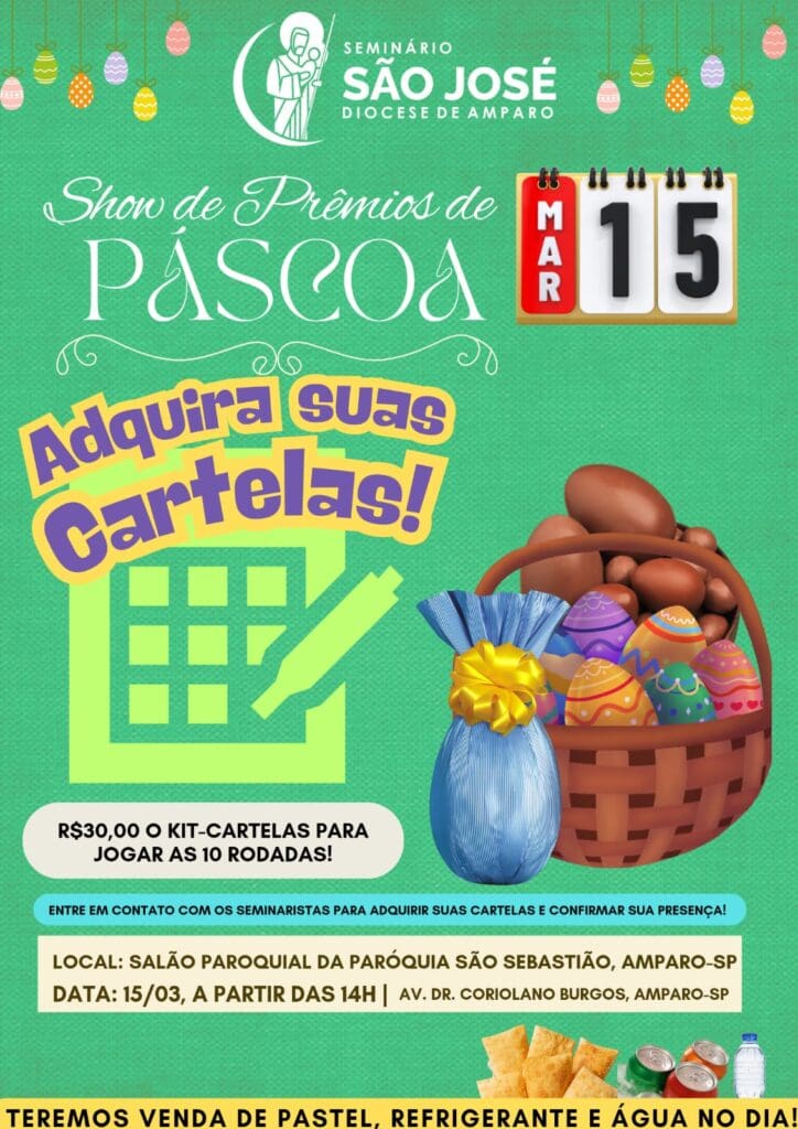 Seminário promove Show de Prêmios de Páscoa em Amparo O Seminário São José realizará, no dia 15 de março, o Show de Prêmios de Páscoa, iniciativa que convida a comunidade a participar de um momento de convivência e apoio às atividades formativas do seminário. O evento acontecerá a partir das 14h, no salão paroquial da […]