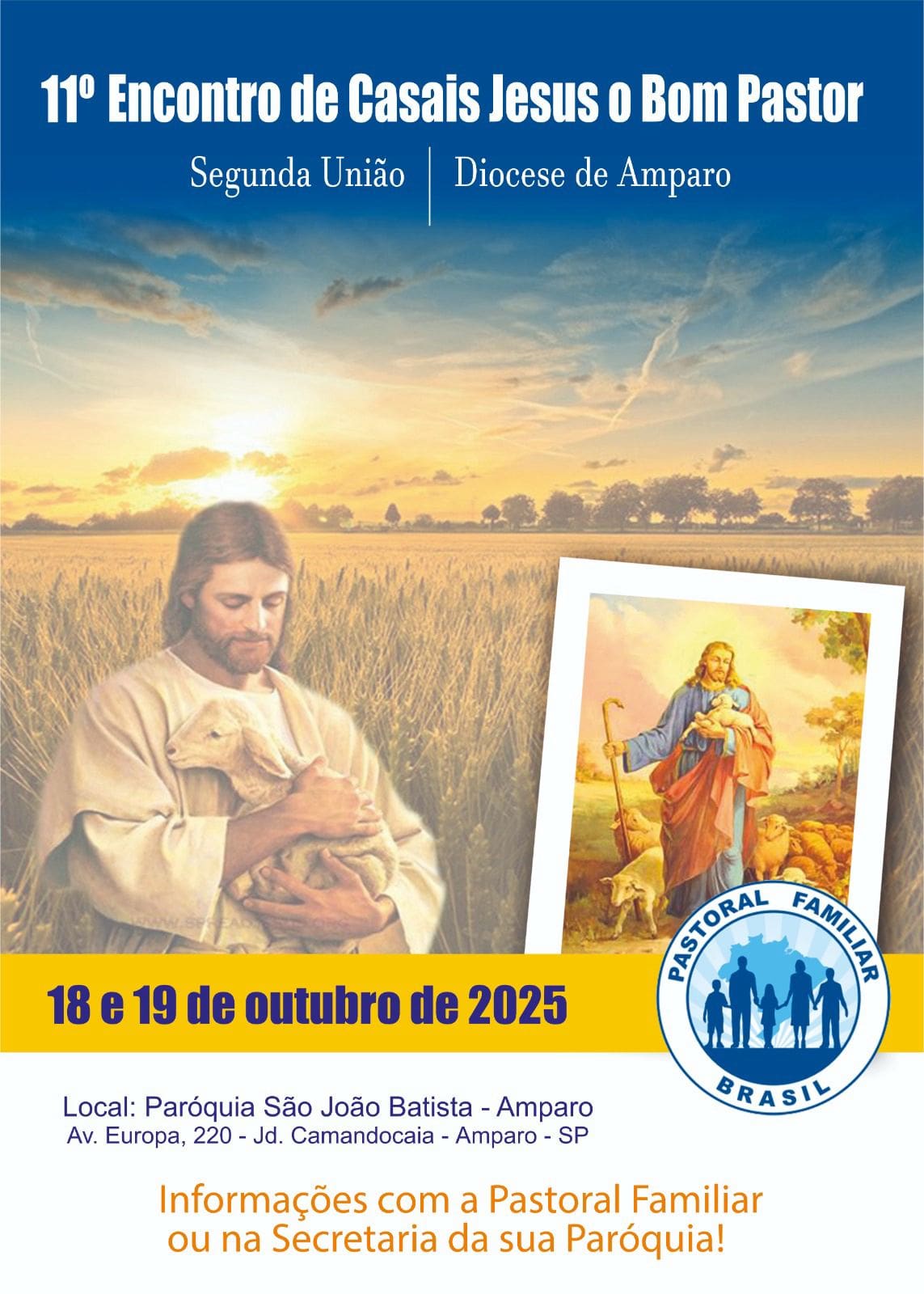 15 de agosto de 2025 Diocese de Amparo promove 11º Encontro de Casais Diocese de Amparo promove 11º Encontro de Casais A Diocese de Amparo, por meio da Pastoral Familiar, realizará nos dias 18 e 19 de
