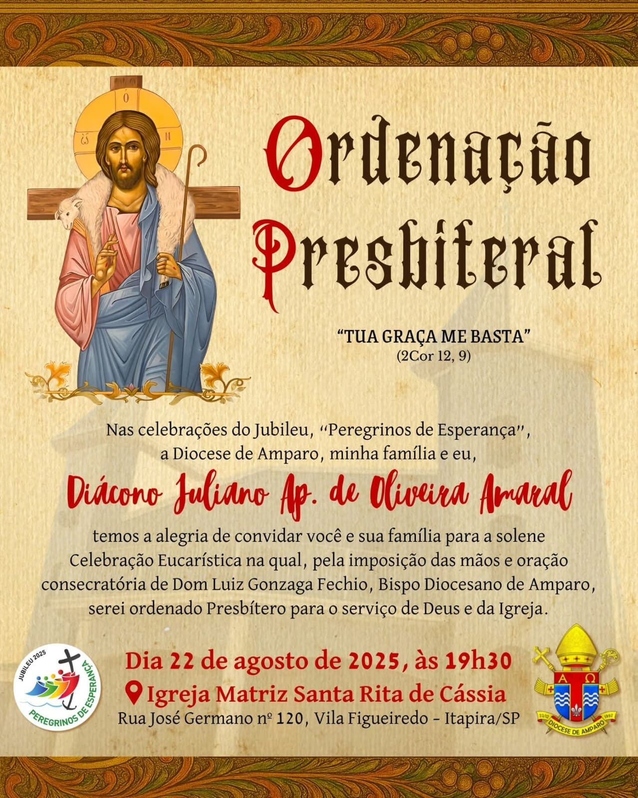 15 de agosto de 2025 Diocese se prepara para ordenação do Diác. Juliano Amaral Diocese se prepara para ordenação do Diác. Juliano Amaral No dia 22 de agosto de 2025, às 19h30, na Igreja Matriz Santa Rita de