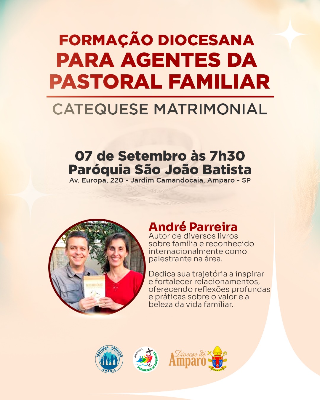 18 de agosto de 2025 Formação diocesana reúne agentes da Pastoral Familiar Formação diocesana reúne agentes da Pastoral Familiar No próximo 07 de setembro, às 7h30, a Paróquia São João Batista, em Amparo, sediará a Formação