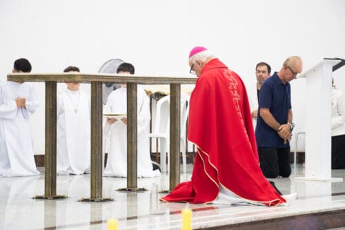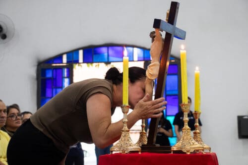 Após a homilia, foi realizada a Oração Universal, momento solene em que a Igreja eleva suas preces por toda a humanidade. Em seguida, teve início a segunda parte da celebração, a Adoração da Cruz, quando os fiéis foram convidados a um gesto de profunda reverência à Santa Cruz de Cristo. Durante este rito, o bispo proclamou: “Eis o lenho da cruz, do qual pendeu a salvação do mundo. Vinde, adoremos”, conduzindo a assembleia a este momento de fé e contemplação.