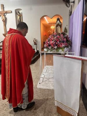 Logo após a carreata, foi celebrada a Santa Missa do 1º dia da novena em honra a Santa Ifigênia, presidida pelo pároco local, Padre Francis Tadeu de Oliveira Mistrelli. O momento marcou o início das celebrações preparatórias em honra à padroeira, reunindo grande número de devotos.