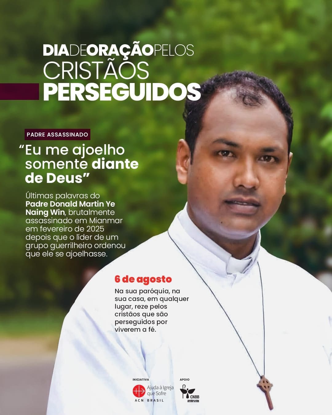 A iniciativa deste ano recorda o martírio do Padre Donald Martin Ye Naing Win, brutalmente assassinado em fevereiro de 2025, em Mianmar, após se recusar a obedecer à ordem de um líder guerrilheiro para se ajoelhar. Suas últimas palavras — “Eu me ajoelho somente diante de Deus” — tornaram-se um testemunho vivo de fidelidade, coragem e amor incondicional a Cristo.