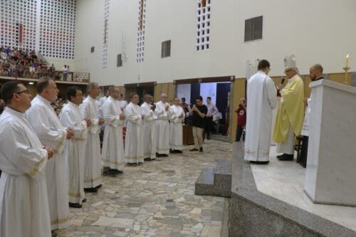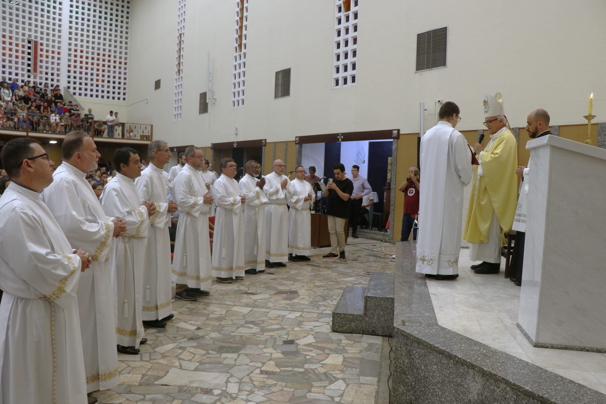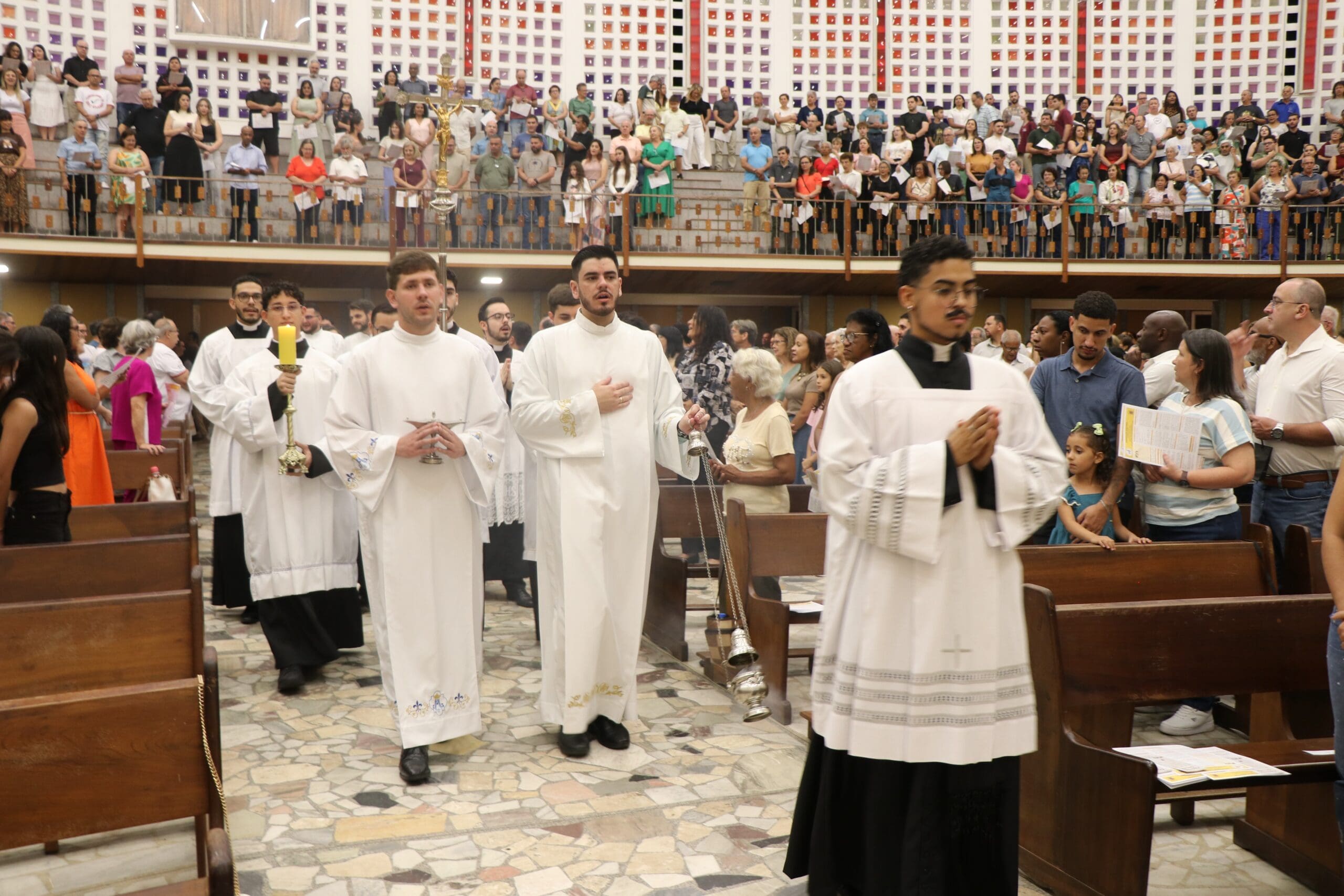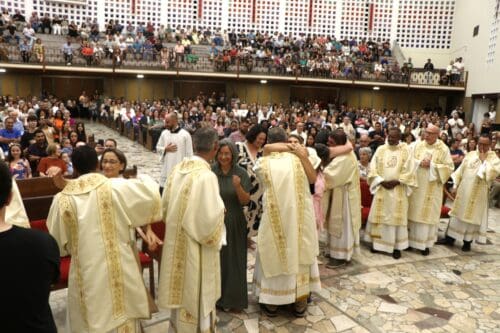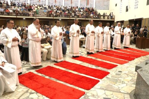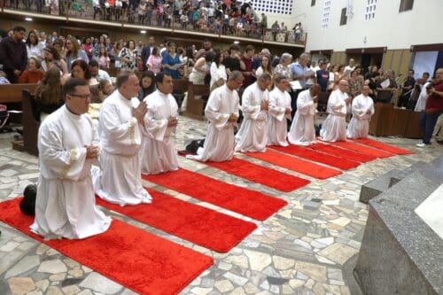 A Diocese de Amparo viveu uma noite de profunda alegria e significado eclesial na sexta-feira, 21 de novembro de 2025, com a Ordenação Diaconal de nove candidatos durante solene celebração realizada na Igreja Matriz São Sebastião, em Amparo. A Santa Missa foi presidida pelo bispo diocesano, Dom Luiz Gonzaga Fechio, que, unido ao clero e ao povo de Deus, conferiu o primeiro grau da Ordem aos novos diáconos permanentes: Élcio Arestides de Mattos da Silva, Guilherme Biselo de Assis, Joel Adamo Bellini, Jorge Márcio Alves, José Geraldo Lúcio Porto, Luís Fernando Favoretto, Nilton Pereira, Vanderlei de Souza e Vanderlúcio José da Silva. Marcada pelo espírito jubilar do Ano “Peregrinos da Esperança”, a celebração reuniu fiéis de diversas paróquias, familiares, amigos e representantes das pastorais, em um ato público de fé que ressaltou a unidade e a vitalidade missionária da Igreja Particular de Amparo.