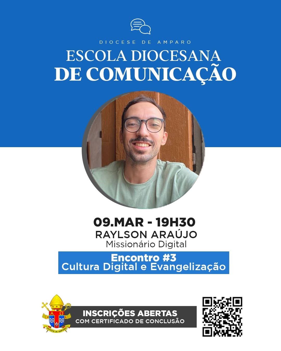 A Diocese de Amparo realiza a Escola Diocesana de Comunicação, iniciativa formativa voltada aos agentes da Pastoral da Comunicação e a fiéis interessados em comunicação e evangelização. A proposta busca qualificar a atuação pastoral, fortalecendo a missão evangelizadora da Igreja nos diversos meios de comunicação.