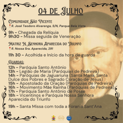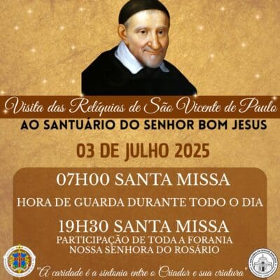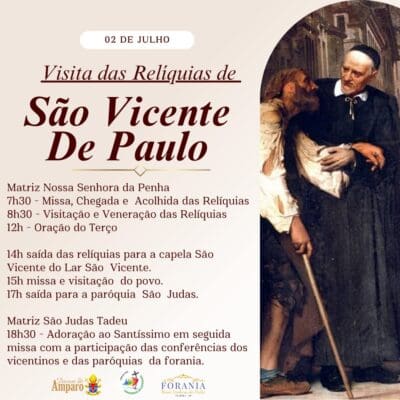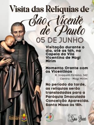 A Diocese de Amparo viverá um momento especial de fé e comunhão com a visita das relíquias de São Vicente de Paulo, que percorrerão as cinco foranias diocesanas entre os dias 1º e 5 de julho de 2025. A peregrinação contará com celebrações e momentos de oração, veneração e espiritualidade, envolvendo paróquias, comunidades e agentes vicentinos de todo o território diocesano.