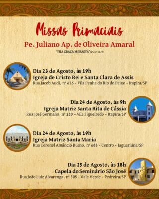 24/08, às 9h – Igreja Matriz Santa Rita de Cássia (Itapira/SP).