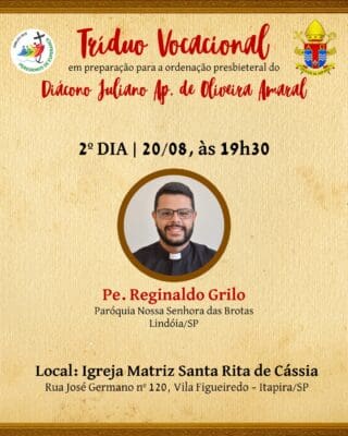 Em preparação para este momento, será realizado o Tríduo Vocacional de 19 a 21 de agosto, sempre às 19h30, na Paróquia Igreja Matriz Santa Rita de Cássia, com as seguintes celebrações:
