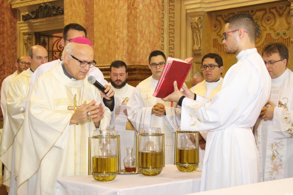 Nesta celebração, que ocorre na manhã da Quinta-feira Santa, o bispo realizou a Bênção dos Santos Óleos e o Clero renovou as promessas sacerdotais.