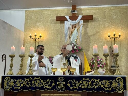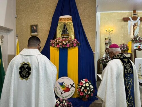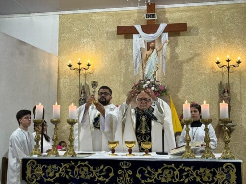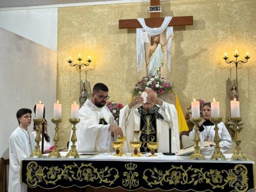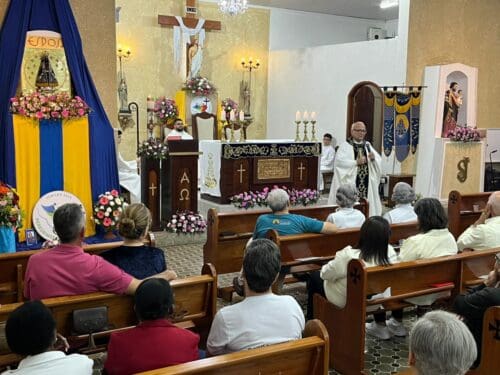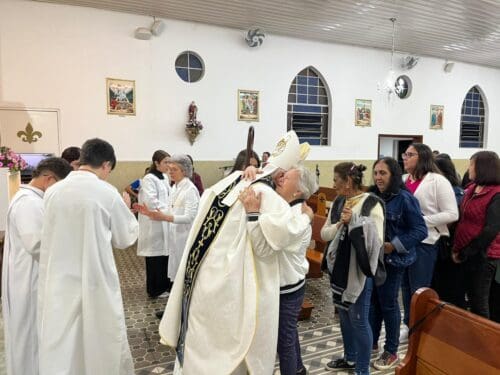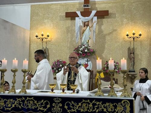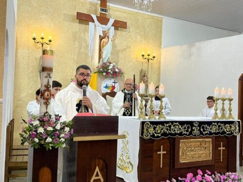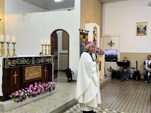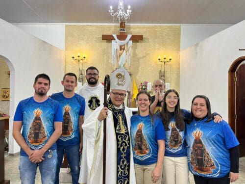 A Santa Missa foi presidida por Dom Luiz Gonzaga Fechio, nosso bispo diocesano, e concelebrada pelo pároco local, Padre Fabrício Fagner Ferreira. A comunidade acolheu com alegria a presença do bispo, reunindo-se em oração e devoção à Mãe Aparecida.