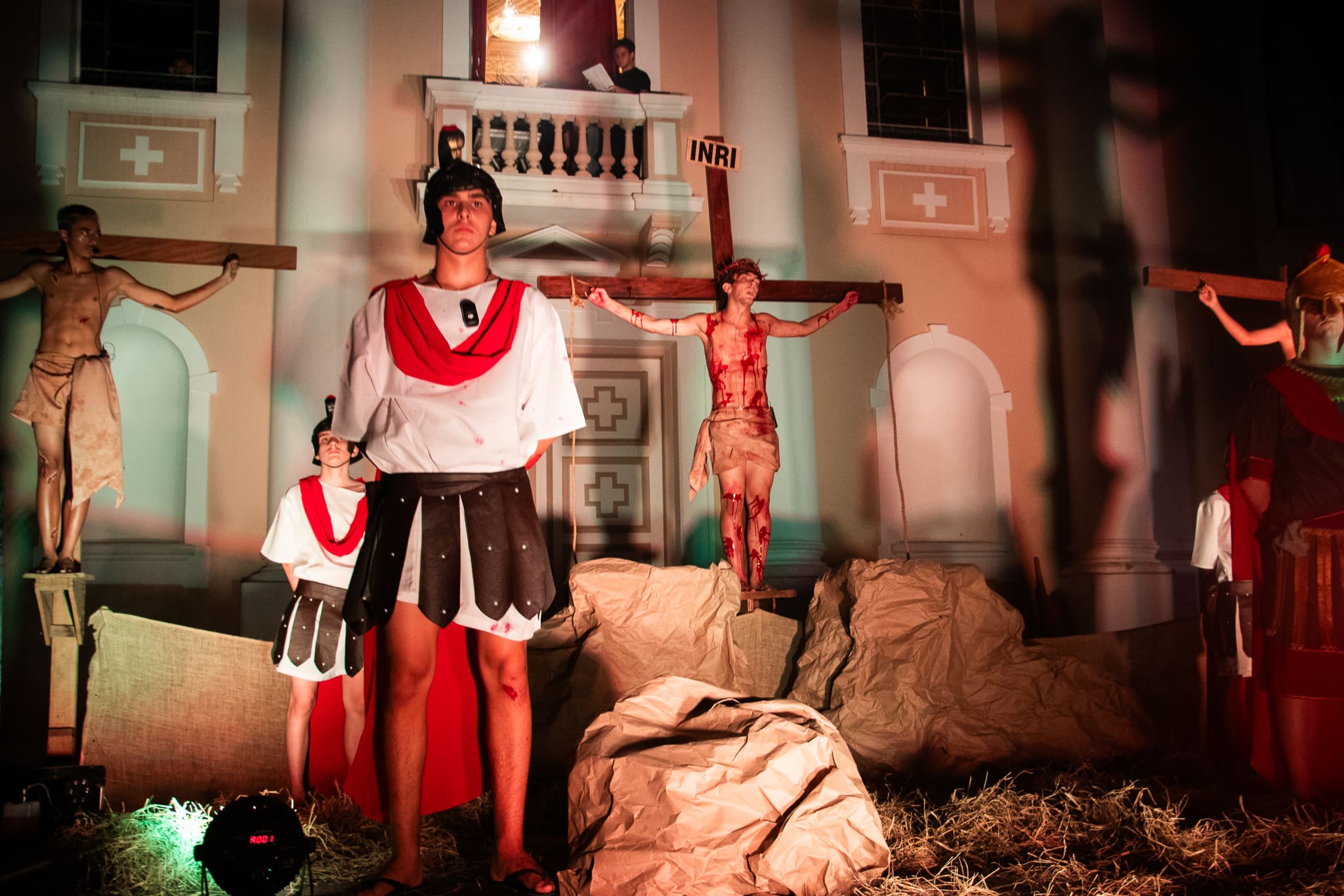 Na noite desta sexta-feira, 3 de abril, a Catedral Diocesana Nossa Senhora do Amparo promoveu a encenação da Paixão de Cristo, realizada pelos jovens do Crisma, reunindo fiéis em um significativo momento de fé e reflexão. A iniciativa, já tradicional na comunidade, foi conduzida com dedicação pelos jovens, proporcionando aos presentes uma vivência profunda do mistério da Paixão do Senhor.