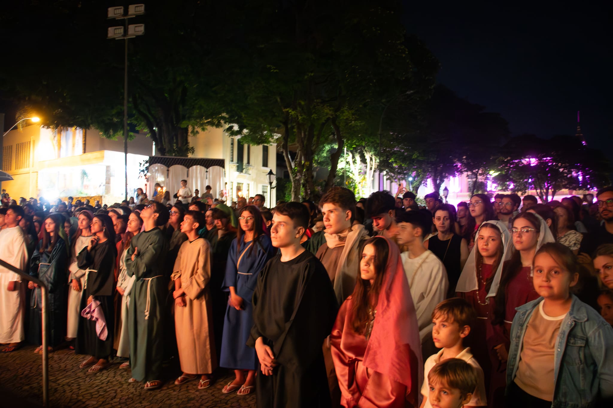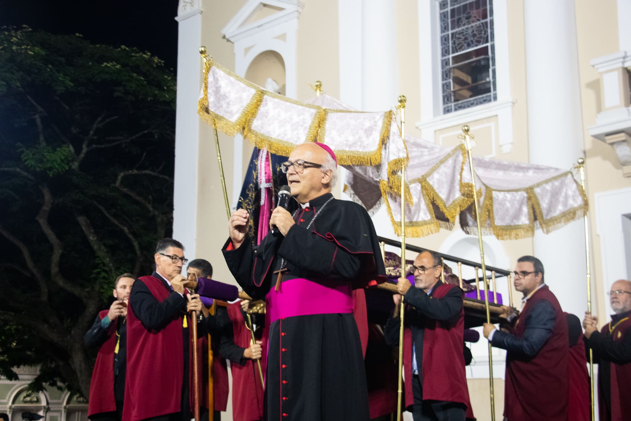 A procissão contou com a presença da imagem do Senhor Morto e de Nossa Senhora das Dores, reunindo a comunidade em um gesto público de fé, recordando o sofrimento e a morte de Cristo. O momento também contou com a presença do bispo diocesano, Dom Luiz Gonzaga Fechio.