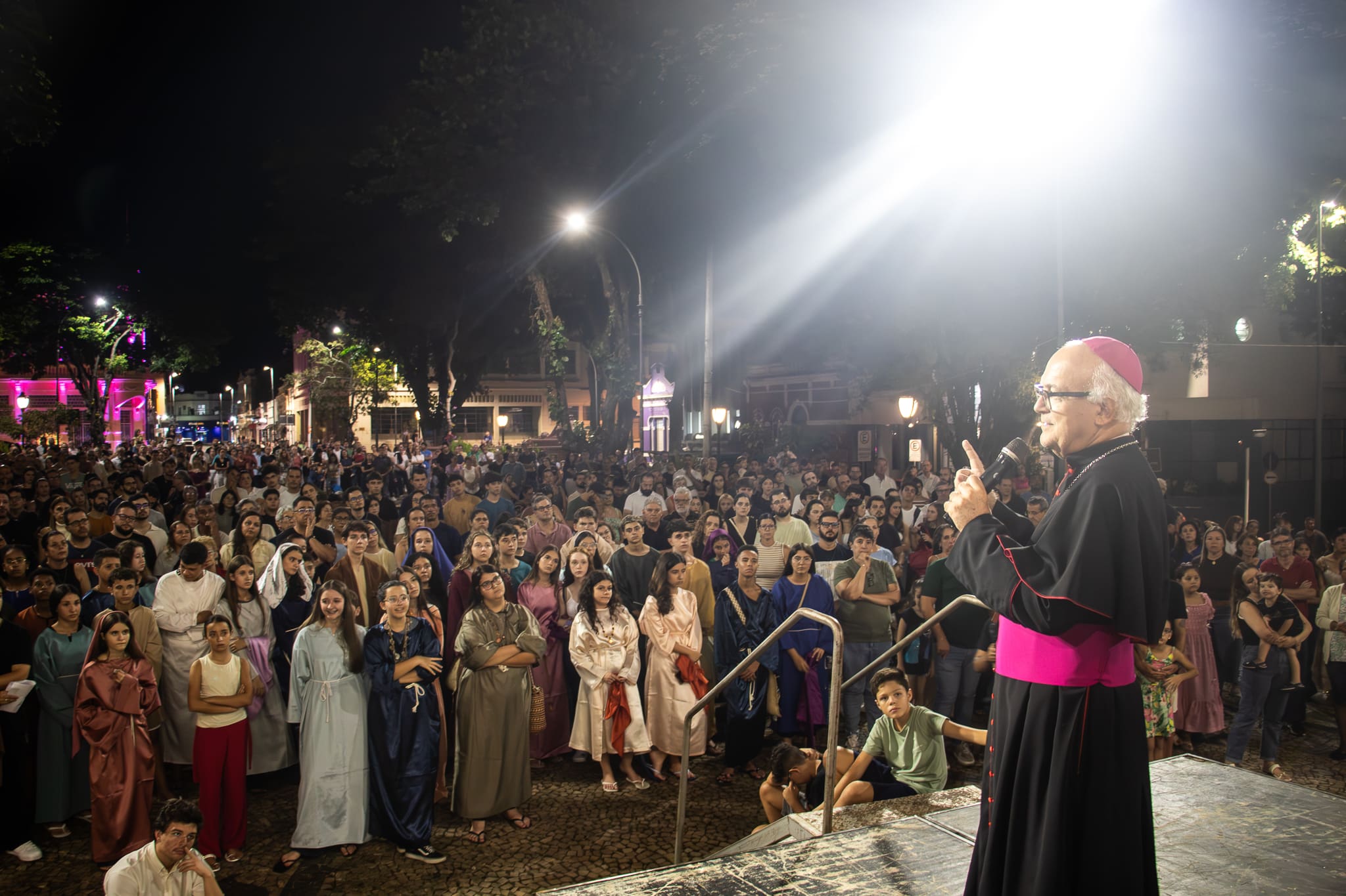 Também Dom Luiz Gonzaga Fechio dirigiu sua reflexão aos presentes, aprofundando o significado espiritual da Sexta-feira Santa. O bispo destacou o sentido do “vazio” e do esvaziamento de Cristo (kénose), convidando os fiéis a refletirem sobre a necessidade de se desapegarem de si mesmos para que Deus possa habitar plenamente em seus corações.