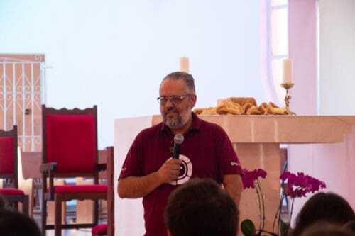 Para encerrar a manhã de aprendizado e comunhão, Pe. Rodolfo conduziu um momento de adoração ao Santíssimo Sacramento, proporcionando um tempo de profunda espiritualidade e gratidão a Deus por todas as experiências vividas.