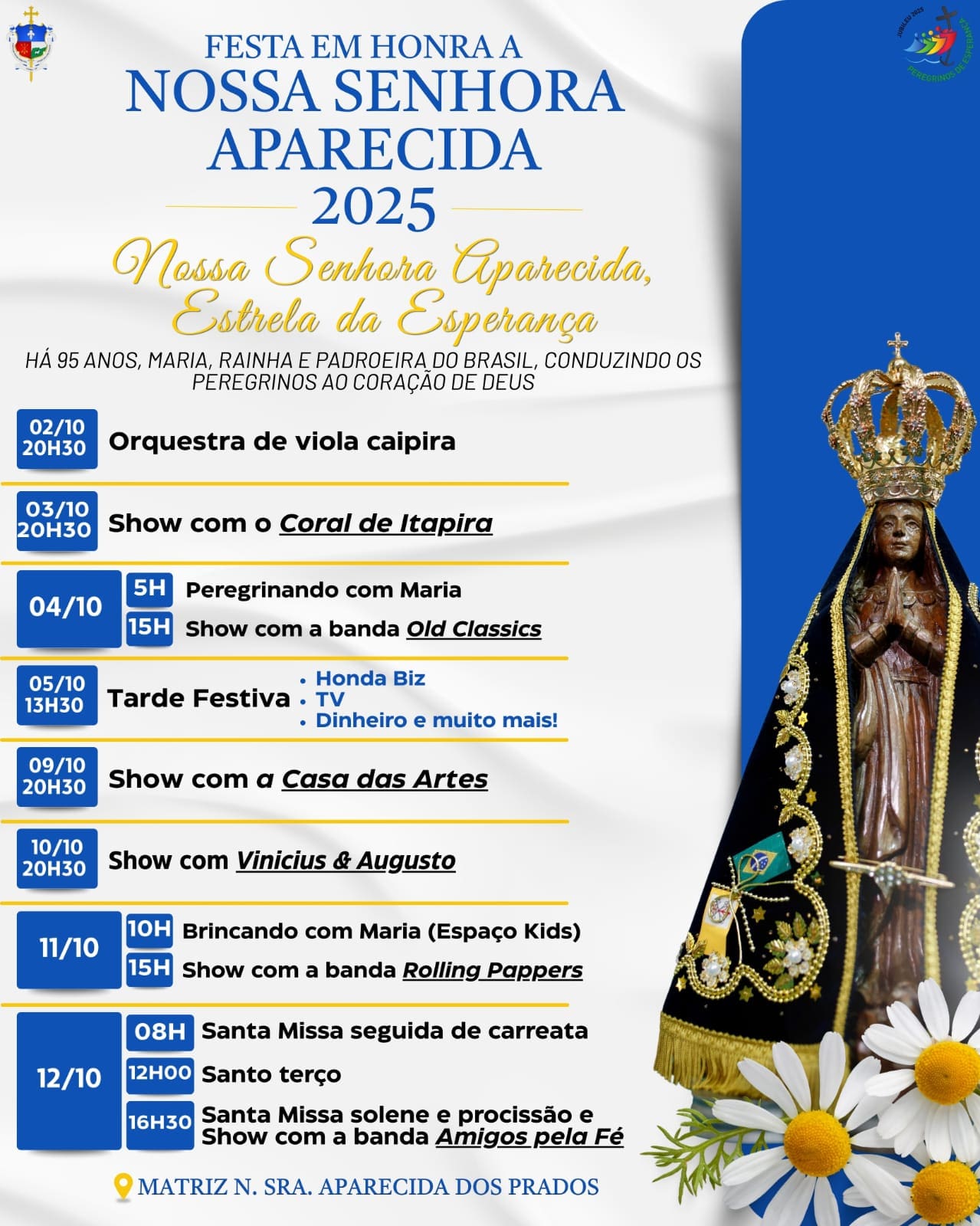 A Paróquia Nossa Senhora Aparecida dos Prados, em Itapira, dará início no dia 2 de outubro à tradicional festa em honra à padroeira do Brasil, que neste ano será celebrada com o tema “Nossa Senhora Aparecida, Estrela da Esperança”. A programação seguirá até o dia 12, reunindo momentos religiosos, culturais e sociais, que devem atrair fiéis e devotos da cidade e região.