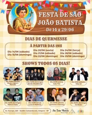 A Paróquia São João Batista, localizada na cidade de Amparo/SP, se prepara para celebrar a tradicional Festa de São João Batista, que acontecerá de 14 a 29 de junho. A programação religiosa contará com momentos de oração, reflexão e celebração da fé, unindo tradição e devoção ao padroeiro da comunidade.