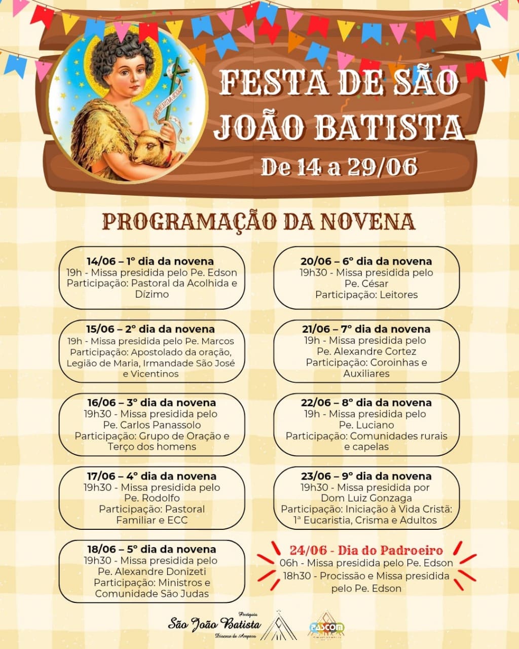 A festa terá início no dia 14 de junho, com o primeiro dia da novena, e seguirá até o dia 23, sempre com a presença de um padre convidado presidindo as celebrações. Nos dias 14, 15 e 23, por serem finais de semana, as Missas acontecerão às 19h, e nos demais dias da novena, às 19h30.