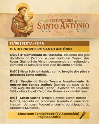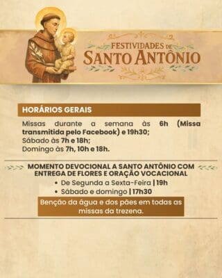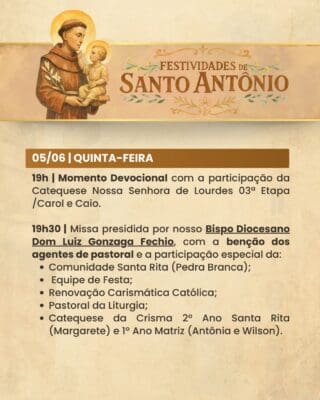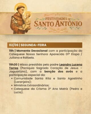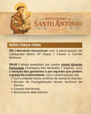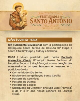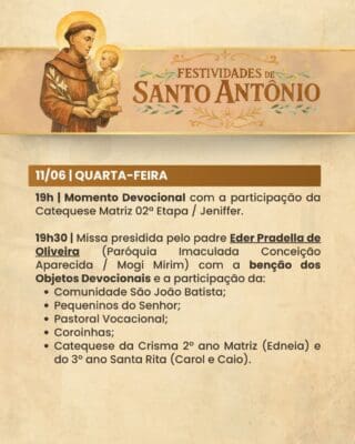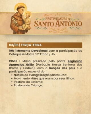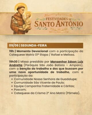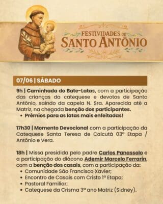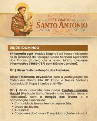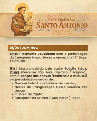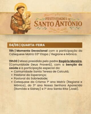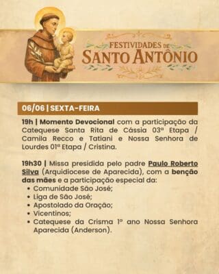 A Paróquia convida a todos os fiéis para participarem com alegria, fé e espírito comunitário das Festividades de Santo Antônio, vivenciando juntos momentos de oração, confraternização e renovação espiritual.