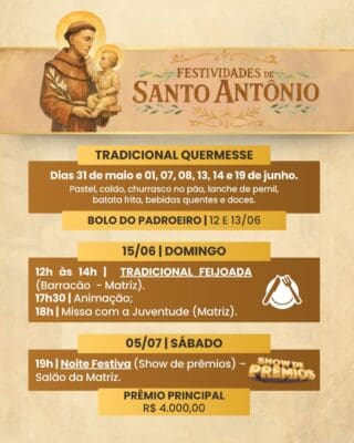 No dia 15 de junho (domingo), será realizada a Tradicional Feijoada, das 12h às 14h, no barracão da Matriz, seguida por momento de animação às 17h30 e Missa com a Juventude, às 18h.