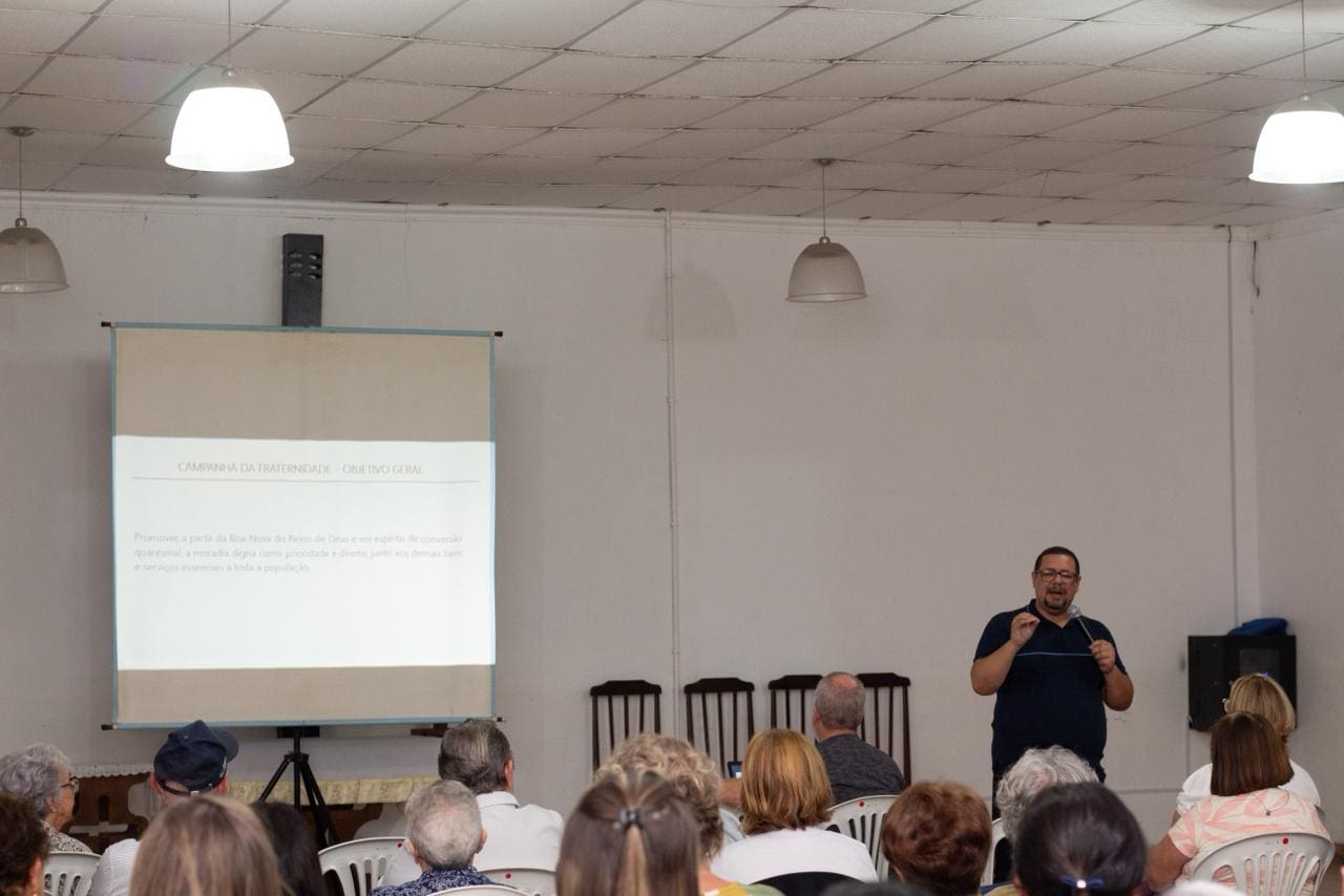 A formação foi conduzida pelo Padre Leandro Lucena Torres, pároco da Paróquia Sagrado Coração de Jesus e assessor diocesano da Campanha da Fraternidade. Durante o encontro, o sacerdote apresentou as principais diretrizes da edição 2026, cujo tema é “Fraternidade e Moradia”, destacando a importância de refletir sobre o direito à habitação digna como expressão concreta da justiça social e da vivência do amor cristão.