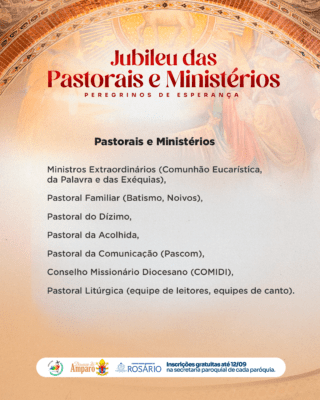Dentro das celebrações do Ano Jubilar “Peregrinos de Esperança”, a Forania Nossa Senhora do Rosário, que reúne as paróquias das cidades de Monte Alegre do Sul, Serra Negra, Lindóia e Águas de Lindóia, realizará no dia 21 de setembro o Jubileu das Pastorais e Ministérios.