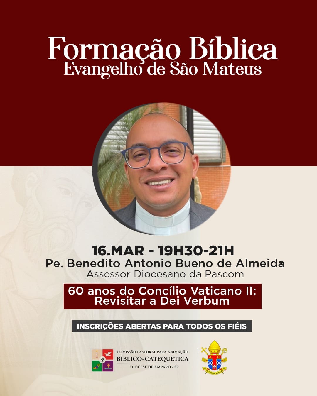 16 de março | 19h30 às 21h Tema: 60 anos do Concílio Vaticano II: Revisitar a Dei Verbum Pe. Benedito A. Bueno Assessor Diocesano da PASCOM