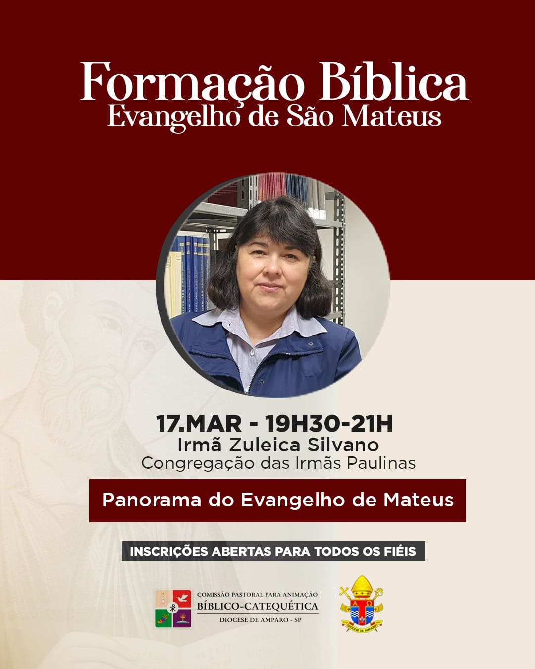 17 de março | 19h30 às 21h Tema: Panorama do Evangelho de Mateus Irmã Zuleica Silvano Congregação das Irmãs Paulinas