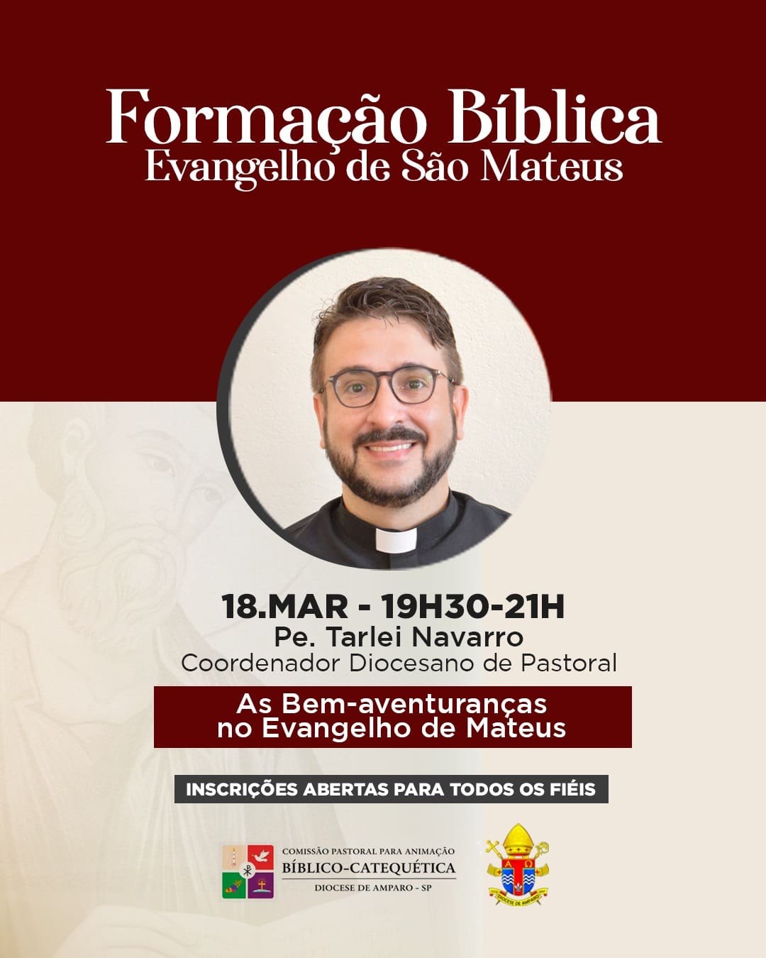18 de março | 19h30 às 21h Tema: As Bem-aventuranças no Evangelho de Mateus Pe. Tarlei Navarro Coordenador Diocesano de Pastoral