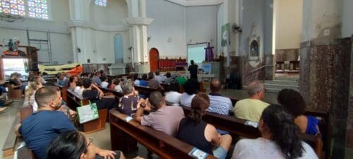 Em seguida, o Diácono Reginaldo de Lima ofereceu uma formação litúrgica, abordando a importância da reverência, da clareza dos gestos e da consciência da missão dos Ministros Extraordinários da Sagrada Comunhão no contexto da celebração eucarística.