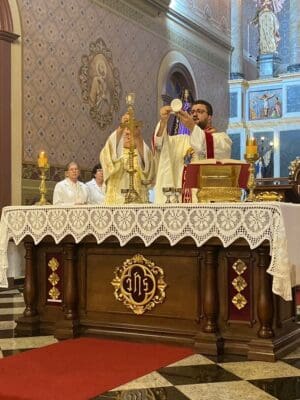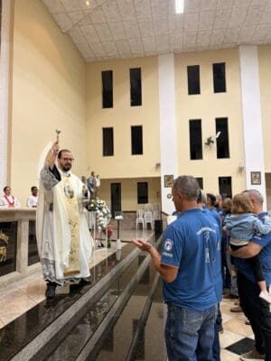 Na Paróquia Nossa Senhora das Brotas, em Lindóia, a celebração foi conduzida pelo pároco, Pe. Erique Fernando Bordini, com a presença do seminarista Alan.