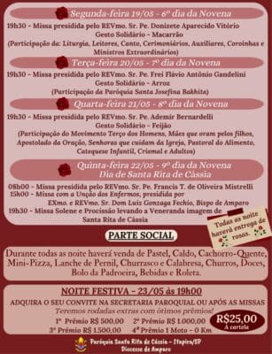 No dia 18 de maio, acontecerá a Caminhada com Santa Rita de Cássia às 4h45, seguida de missa. Já no dia 22 de maio, dedicado à santa, serão celebradas três missas: às 8h, às 15h (com Unção dos Enfermos, presidida por Dom Luiz Gonzaga Fechio, bispo diocesano) e às 19h30, com missa solene e procissão com a imagem de Santa Rita.