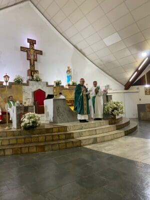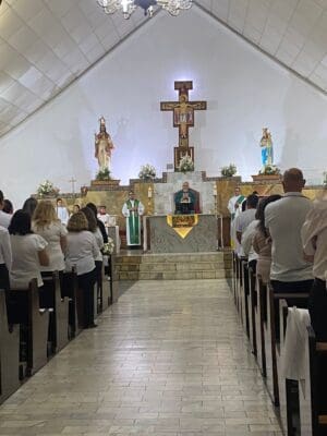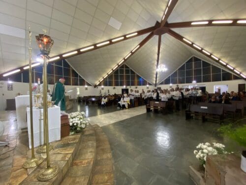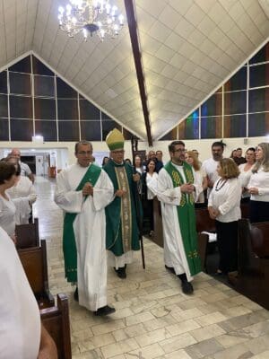 Na última quinta-feira, 25 de setembro de 2025, a Paróquia Nossa Senhora das Graças, em Águas de Lindóia, viveu uma noite de profunda fé e comunhão com a celebração da investidura dos Ministros Extraordinários da Sagrada Eucaristia. A Santa Missa foi presidida pelo bispo diocesano, Dom Luiz Gonzaga Fecchio, e concelebrada pelo pároco local e também Coordenador Diocesano de Pastoral, Padre Tarlei Navarro Pádua Souza, contando ainda com a presença do Diácono Reginaldo de Lima.