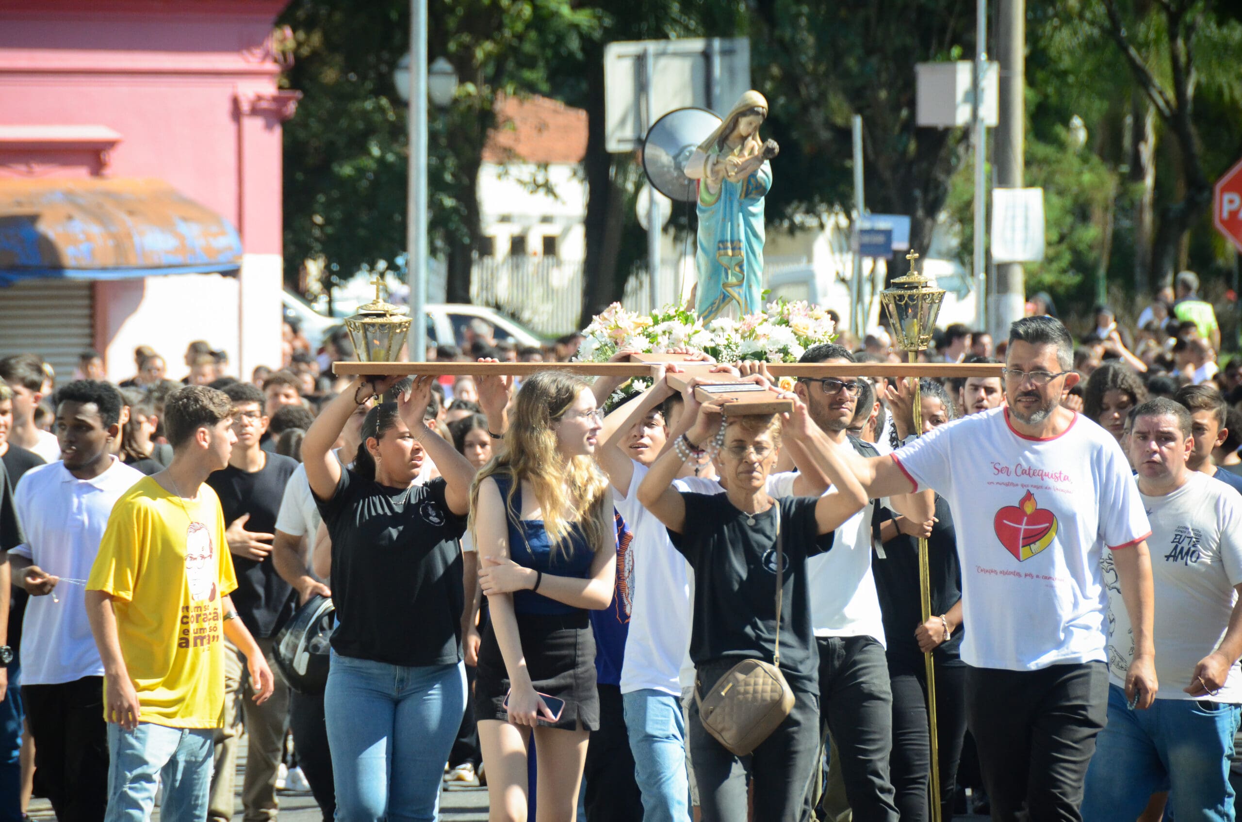 Em seguida, teve início uma procissão até o Centro de Pastoral São João Paulo II, da Paróquia São Sebastião. Durante o trajeto, foram conduzidos a Cruz do Setor Juventude e o andor de Nossa Senhora do Amparo, enquanto o Terço Mariano era rezado, intercalando os mistérios com alegres cânticos.
