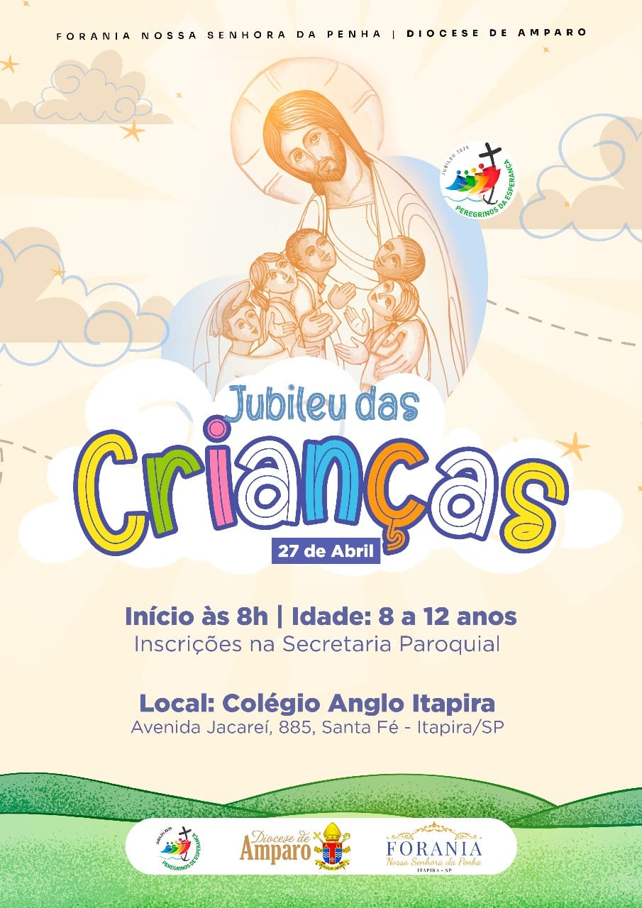 Dentro das celebrações do Ano Jubilar “Peregrinos de Esperança” a Forania Nossa Senhora da Penha, composta pelas sete paróquias da Cidade de Itapira, realizará no dia 27 de abril, o Jubileu das Crianças. Este encontro acontecerá nas dependências do Colégio Anglo de Itapira, com início previsto para as 8h e desenvolvimento ao longo de todo o dia tendo seu encerramento com a Santa Missa às 15h.