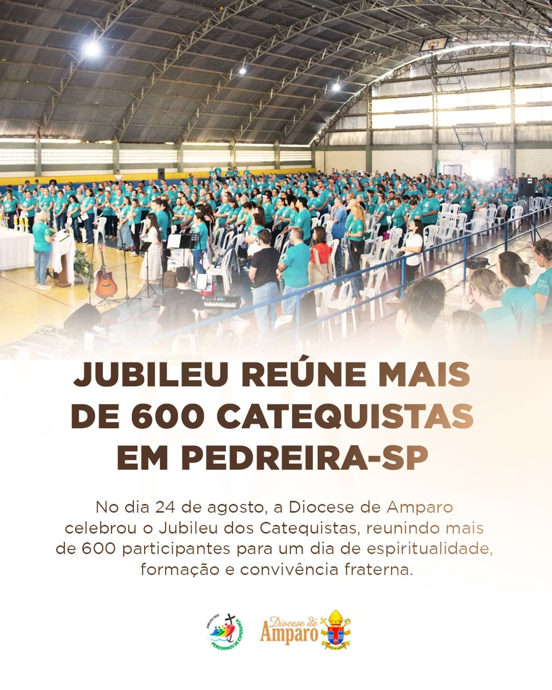 No último domingo, 24 de agosto de 2025, aconteceu em Pedreira/SP o Jubileu dos Catequistas, marcado por um intenso dia de espiritualidade, formação e convivência fraterna, promovido pela Coordenação Diocesana de Pastoral, em comunhão com o Conselho Diocesano de Pastoral e o Conselho de Leigos, reuniu mais de 600 catequistas, vindos de diversas paróquias de todas as foranias da Diocese de Amparo.