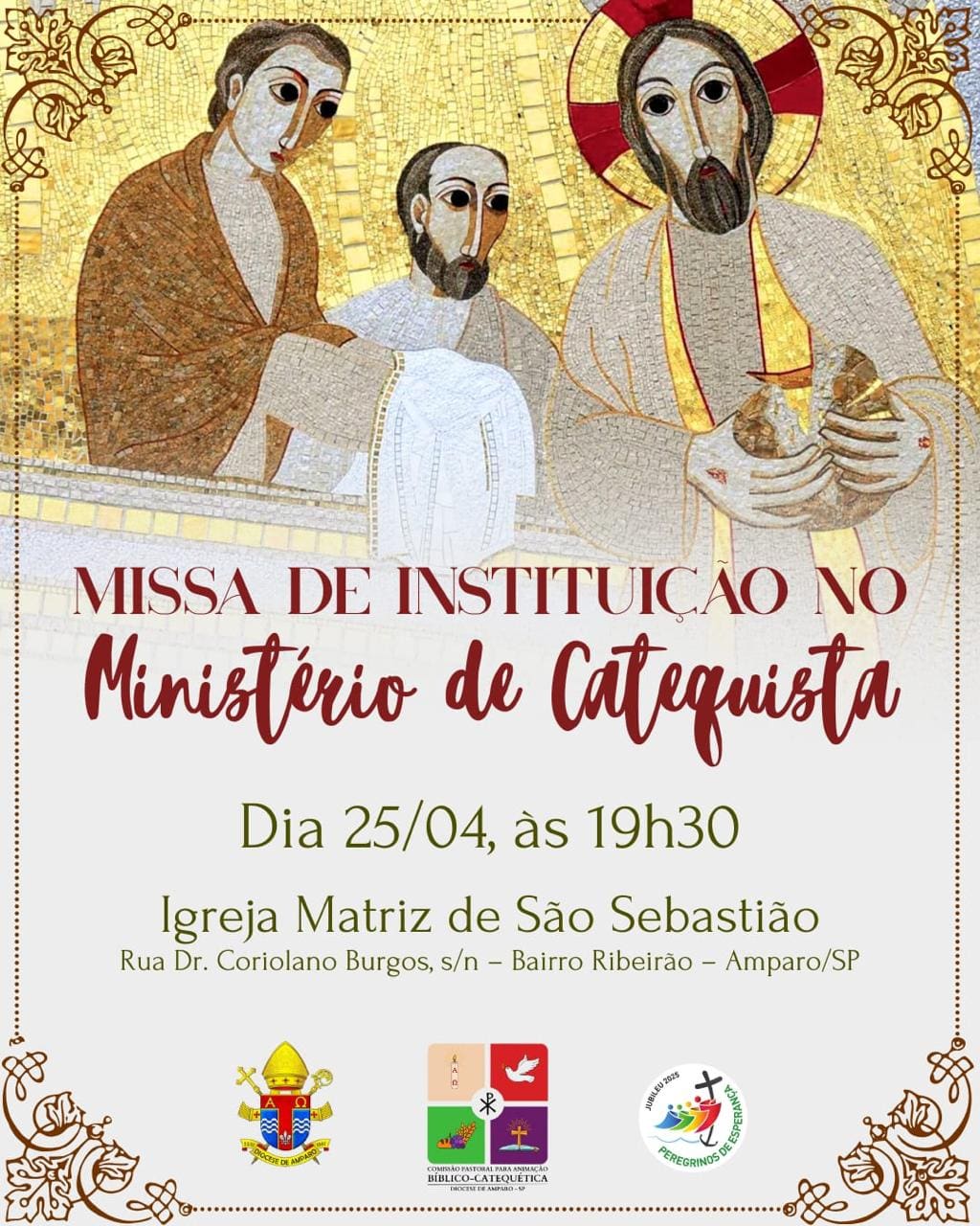 Com alegria, convidamos para a Missa de Instituição no Ministério de Catequista, que será celebrada no dia 25 de abril, às 19h30, na Igreja Matriz de São Sebastião, localizada na Rua Dr. Coriolano Burgos, s/n – Bairro Ribeirão – Amparo/SP.