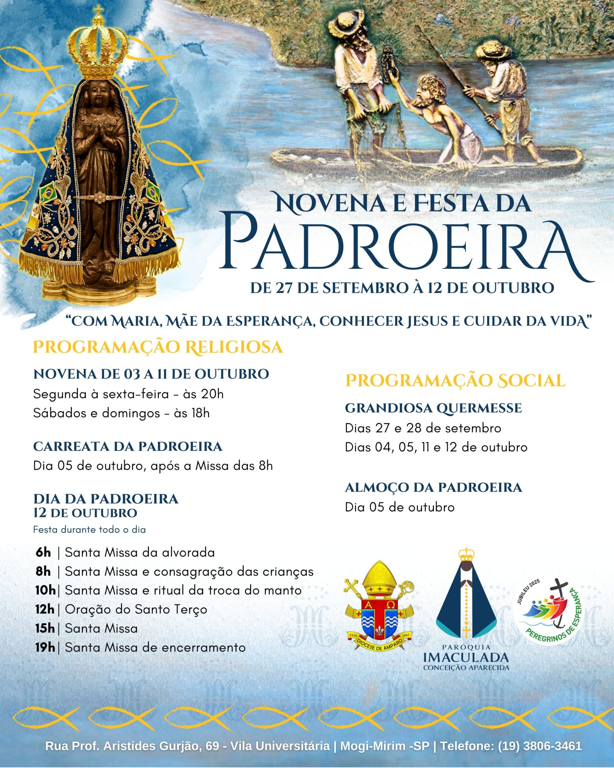 A Paróquia Imaculada Conceição Aparecida, de Mogi Mirim, se prepara para celebrar com fé e devoção a Novena e Festa da Padroeira, que acontecerá de 27 de setembro a 12 de outubro de 2025, com o tema “Com Maria, Mãe da Esperança, conhecer Jesus e cuidar da vida”.