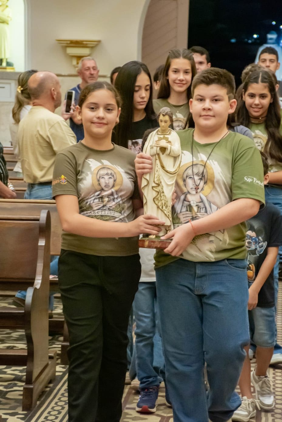 Na mesma ocasião, também foi entronizada a imagem de São Tarcísio, conhecido como patrono dos coroinhas e auxiliares da liturgia. A presença da imagem destaca a importância do serviço dos jovens no altar e na vida da Igreja.
